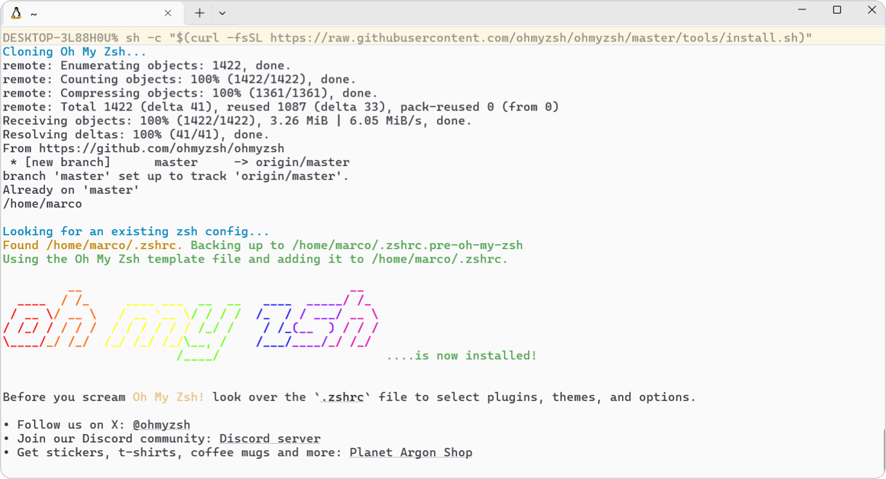 Para una experiencia de Zsh más rica, podemos instalar Oh My Zsh. En la terminal ejecutamos el siguiente comando: