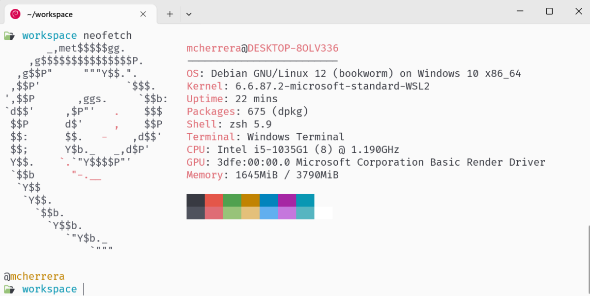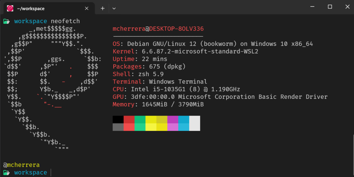 WSL es una capa de compatibilidad que permite ejecutar un entorno Linux directamente en Windows, sin necesidad de una máquina virtual o un arranque dual. Esto significa que puedes utilizar aplicaciones de Linux junto con aplicaciones de Windows, todo desde la misma interfaz. En la siguiente captura, podemos ver un sistema GNU/Linux Debian, ejecutándose en Windows Terminal: