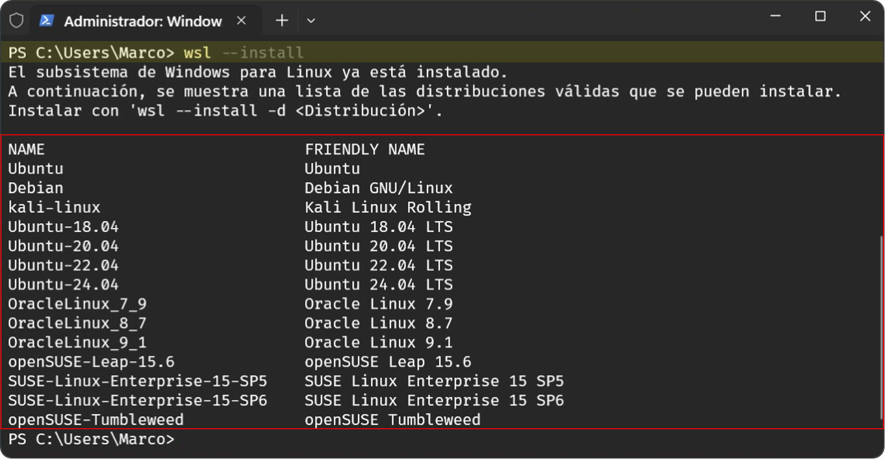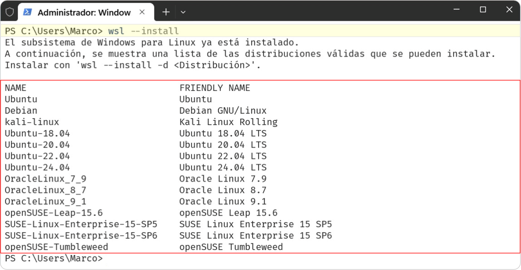Esto instalará la última versión de WSL y la distribución de Linux predeterminada (normalmente Ubuntu). Si ya se encuentra instalada nos muestra las distribuciones disponibles: