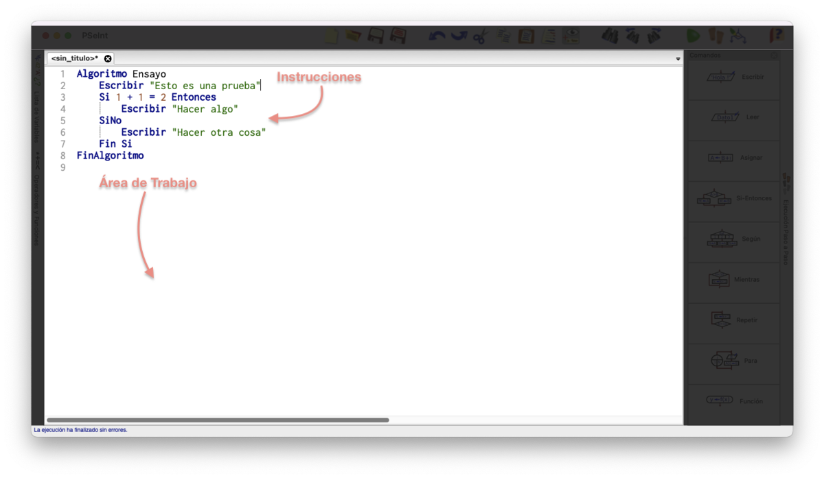 - Es el espacio principal donde escribimos nuestro pseudocódigo. Aquí es donde definimos las instrucciones de un algoritmo.