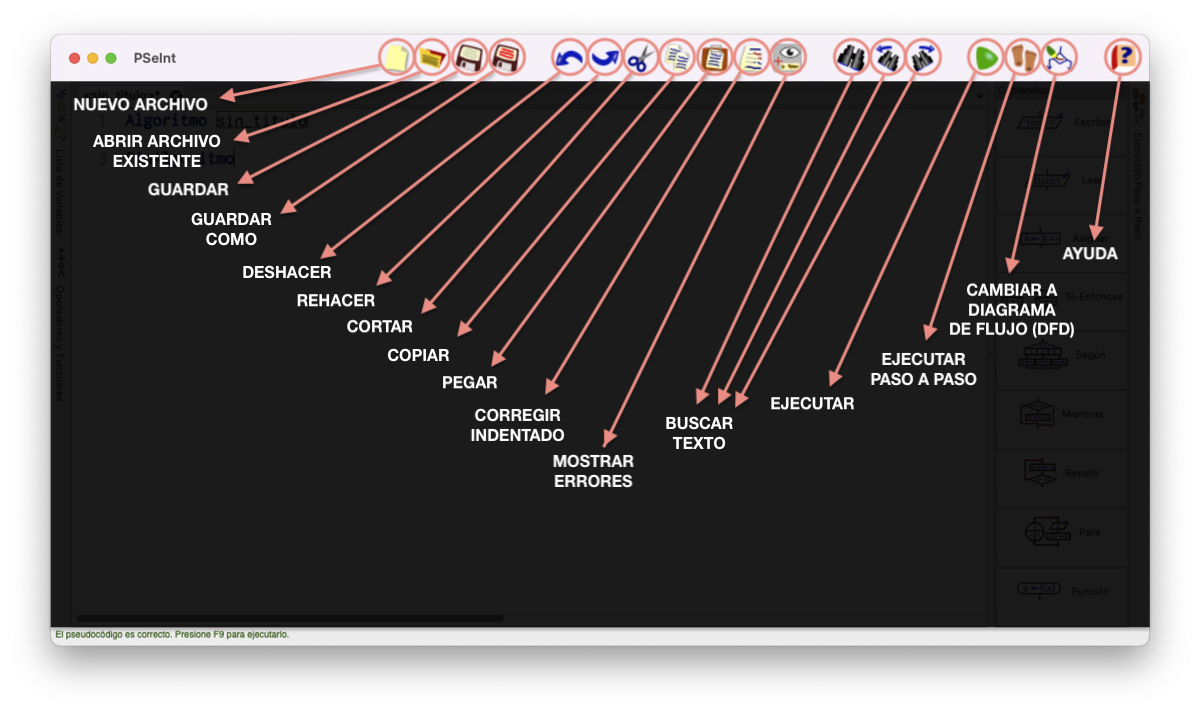 - Justo encima del área de trabajo, se encuentra la barra de herramientas, esta barra proporciona accesos rápidos a funciones importantes, como crear un nuevo archivo, guardar, ejecutar un algoritmo o depurarlo paso a paso, etc.