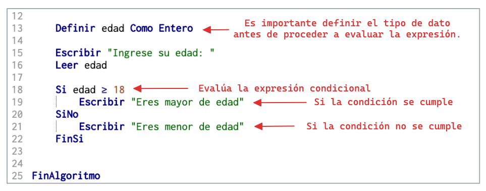 Continuando con nuestro pseudocódigo, podemos definir una variable edad para almacenar este dato que ingresará el usuario, luego vamos a evaluar este dato usando un condicional. Ejemplo: