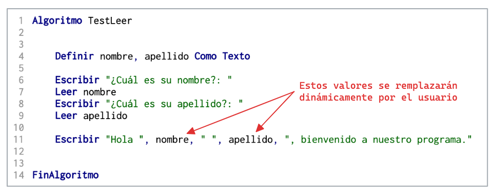 Anteriormente, ya hemos definido algunas variables. Ahora, si queremos almacenar información que ingrese un usuario desde el teclado, debemos utilizar la instrucción Leer. Ejemplo: