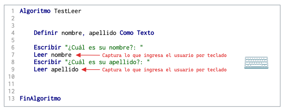 Cuando queremos que el usuario ingrese información desde el teclado, utilizamos la instrucción Leer, como se muestra en la ilustración: