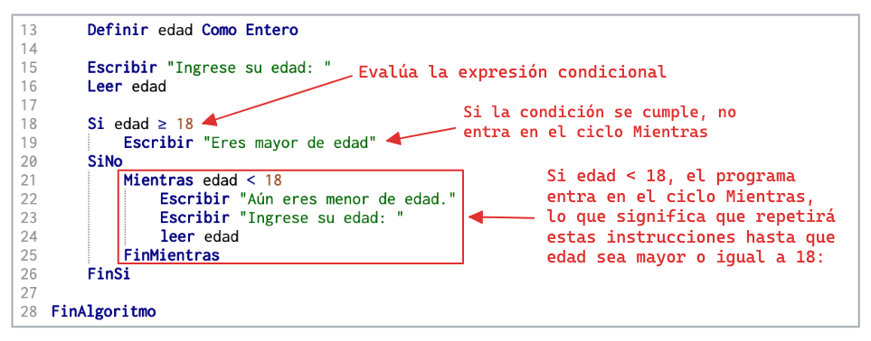 Continuando con el pseudocódigo, utilizamos el ciclo mientras Mientras para mantener al usuario ingresando su edad hasta que sea mayor a 18, como lo muestra la siguiente ilustración:
